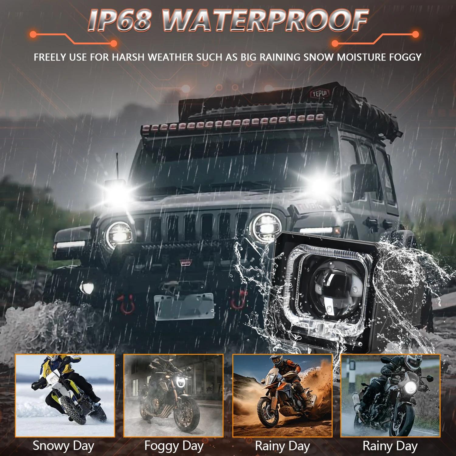 Almost compatible with all motorcycles, jeeps, four wheeled vehicles, trucks, tractors, trailers, golf carts, vans, cars, motorcycles, SUVs, ATVs. In addition, there are many indoor and outdoor uses: yard lights, backyard lights, backup lights, high beams, backup lights, (DC9-60V available)